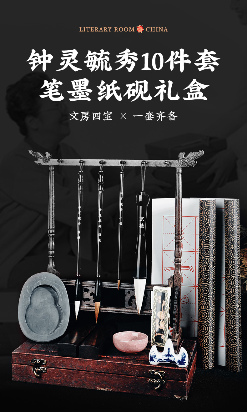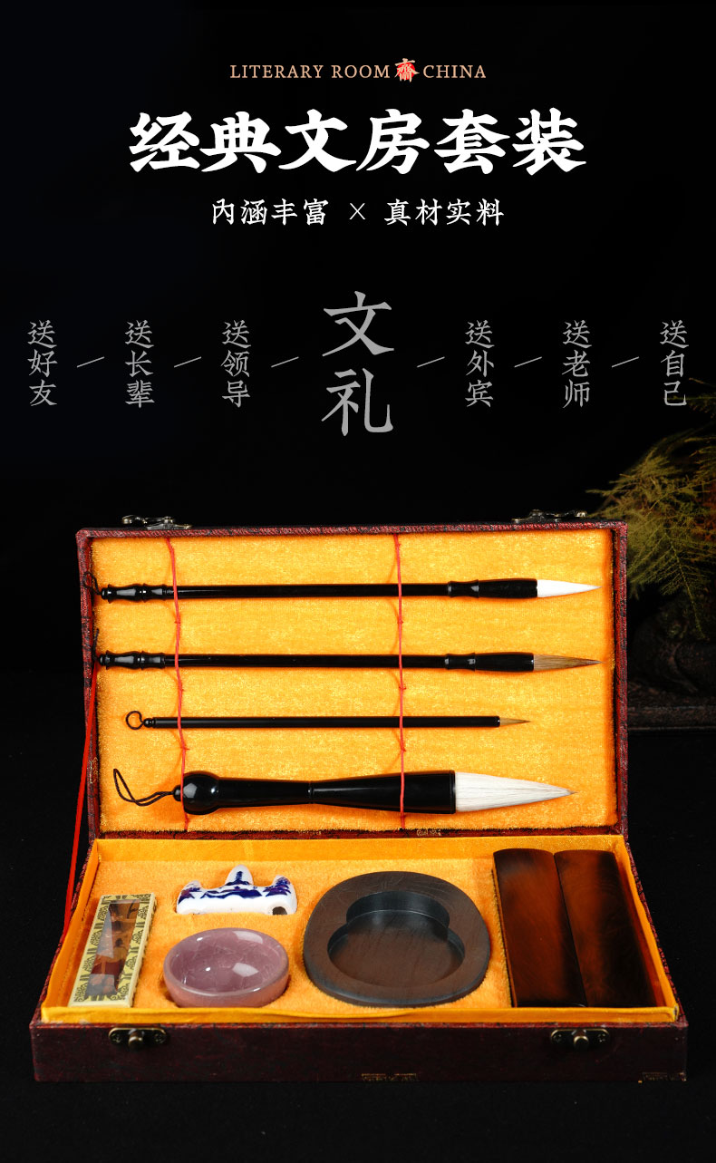 商品名称:荣宝斋 文房四宝礼盒 狼毫羊毫兼毫毛笔 墨锭砚台镇尺笔搁套装 钟灵毓秀套装